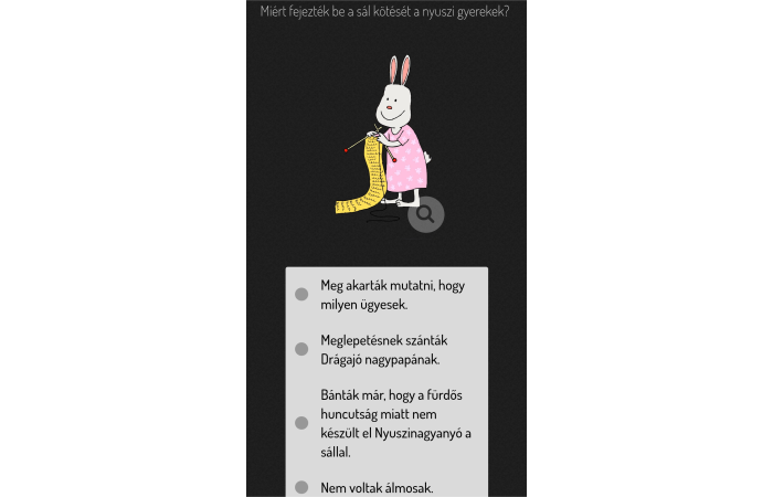 Válaszoljunk a 2 db quiz kérdésre és csináljuk meg a meséhez tartozó feladatot! Látni fogjuk, hogy jó-e a válasz, ha nem, mi lett volna a helyes megfejtés. Minden jó válaszért 1 pont jár. Ha a csapatunk színének megfelelő papírcsík van a lapra ragasztva, azt óvatosan szedjük le, és vigyük magunkkal!